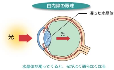 白内障とは、目の中の水晶体という部分が白く濁ってきてものが見えなくなる病気です。