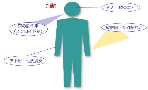 その他、全身疾患に伴う白内障(アトピー、糖尿病)、併発白内障(ぶどう膜炎)、ステロイド白内障(ステロイド剤の長期投与)などがあります。