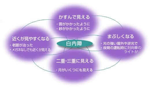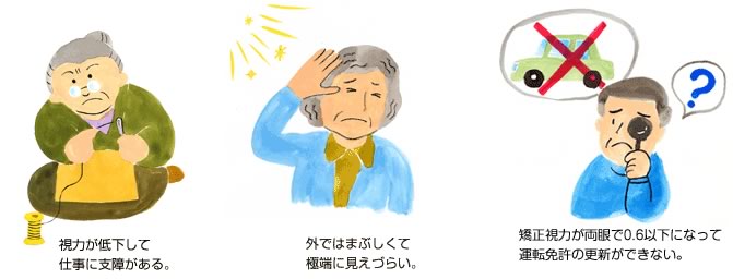 例えば、自動車の運転をする人は、免許更新が出来なくなれば手術しなければなりませんし、細かい文字が読めなくなったら、手術を考えてみる時期でしょう。瞳が白くなってしまうまで手術しないでおくと、他の病気(ぶどう膜炎や緑内障)が起こることがあります。